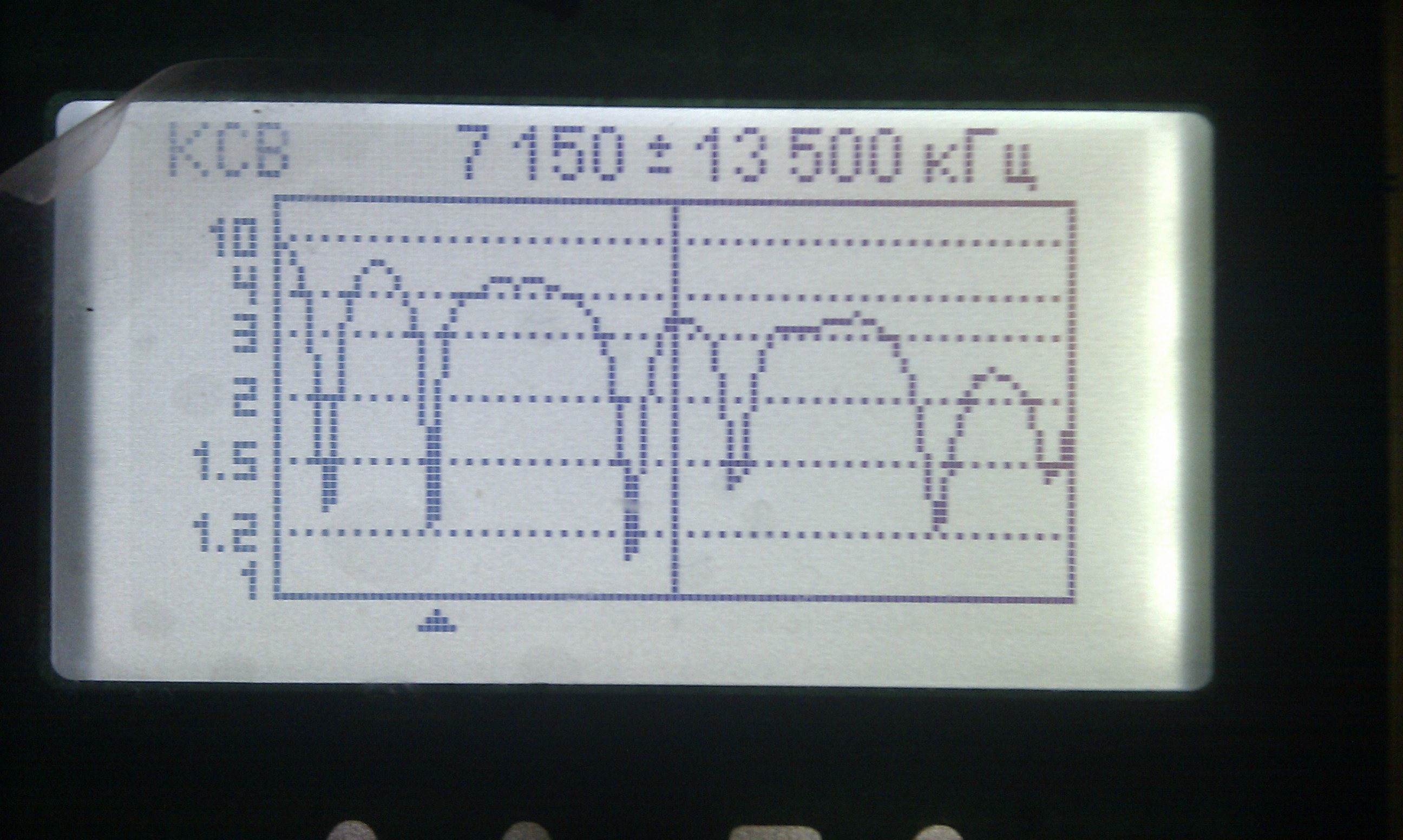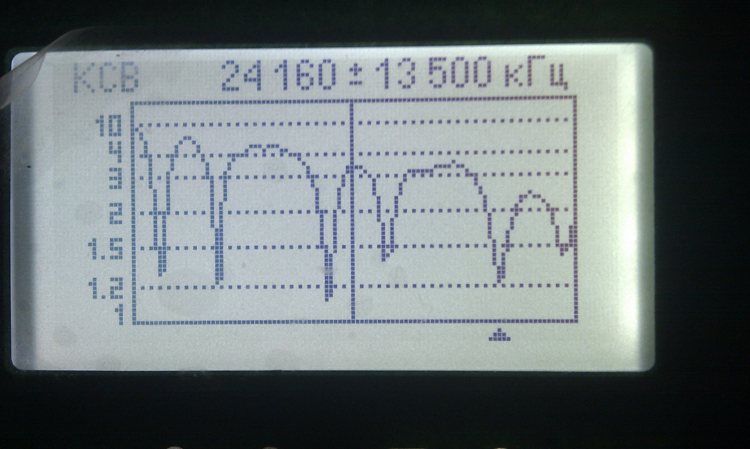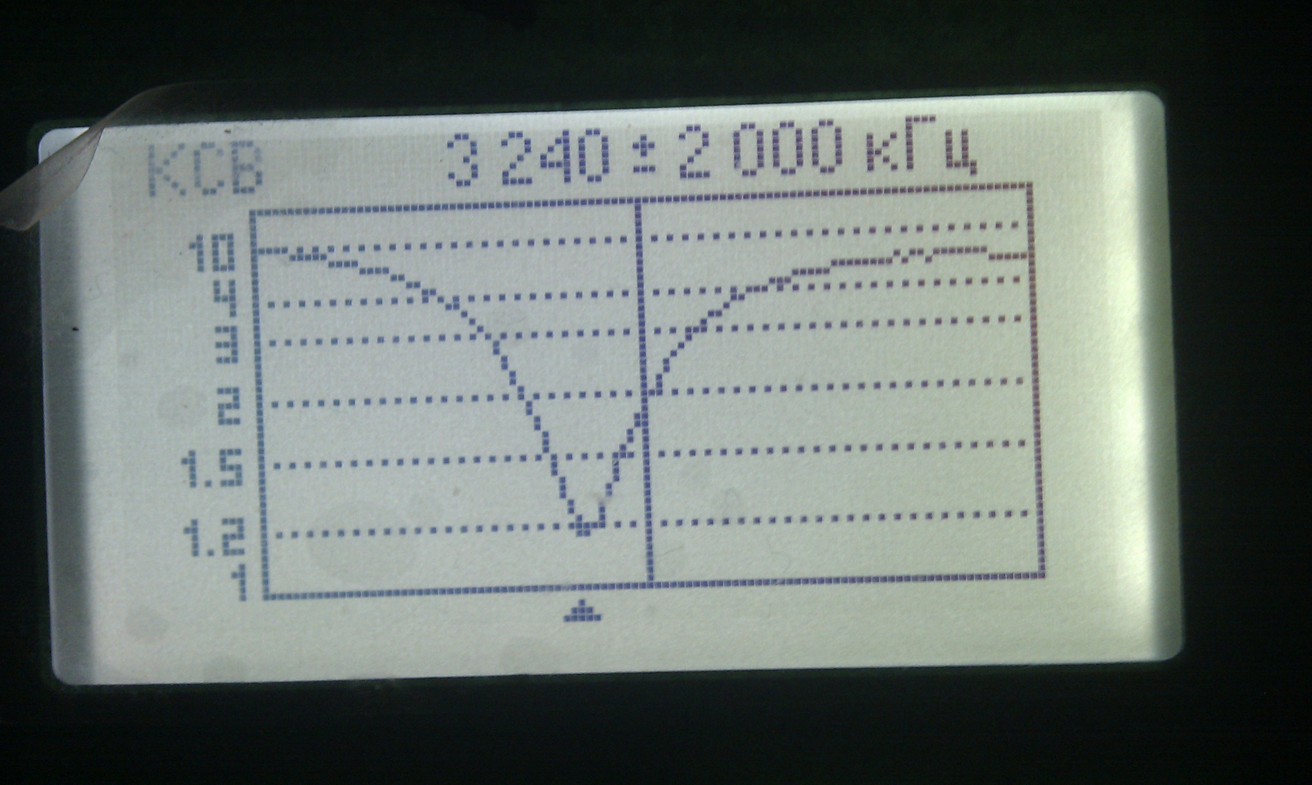 После того как все протянули, подключил антенный анализатор и поглядел что получилось. С первого взгляда мне картинка понравилась. Но при детальном рассмотрении оказалось, что резонансы получились ниже нужных частот. Надо настраивать, т.е. укорачивать антенну, но это значит надо снова залазить на столб и снимать антенну.