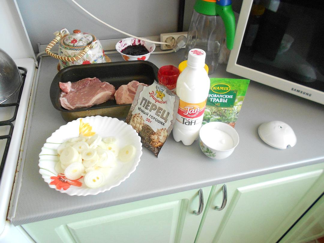 Кусочеки духовой свининки, лук репка, перец, соль, прованские травы и ... кисломолочный продукт - тан. Маринуем - лучек, соль, перчик, травки слоями с мясом заливаем таном и на часика 4 в холодильник.