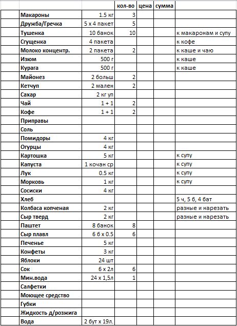 1. Только на еду без мяса и алкоголя надо собирать по 500р. с человека (из имеющегося на сегодня списка примерно 24 человека, некоторых детей считал за 0,5)