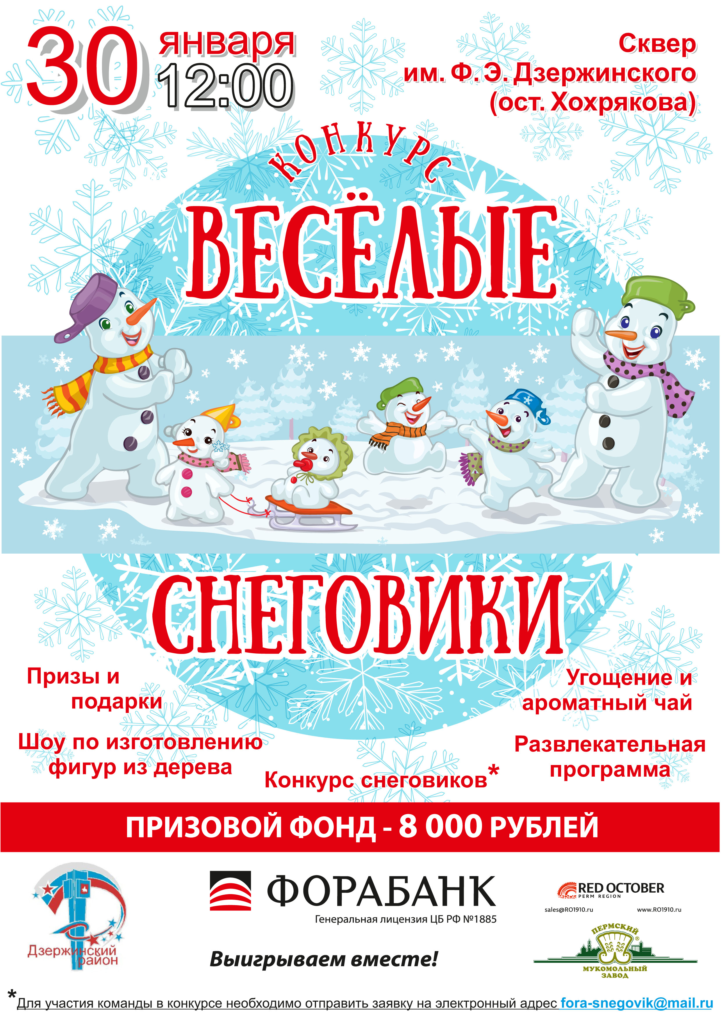 Парковчане, 30 января (суббота) в 12.00 будет проводиться конкурс "ВЕСЕЛЫЕ СНЕГОВИКИ", которое состоится в сквере им. Дзержинского (ост. Хохрякова).