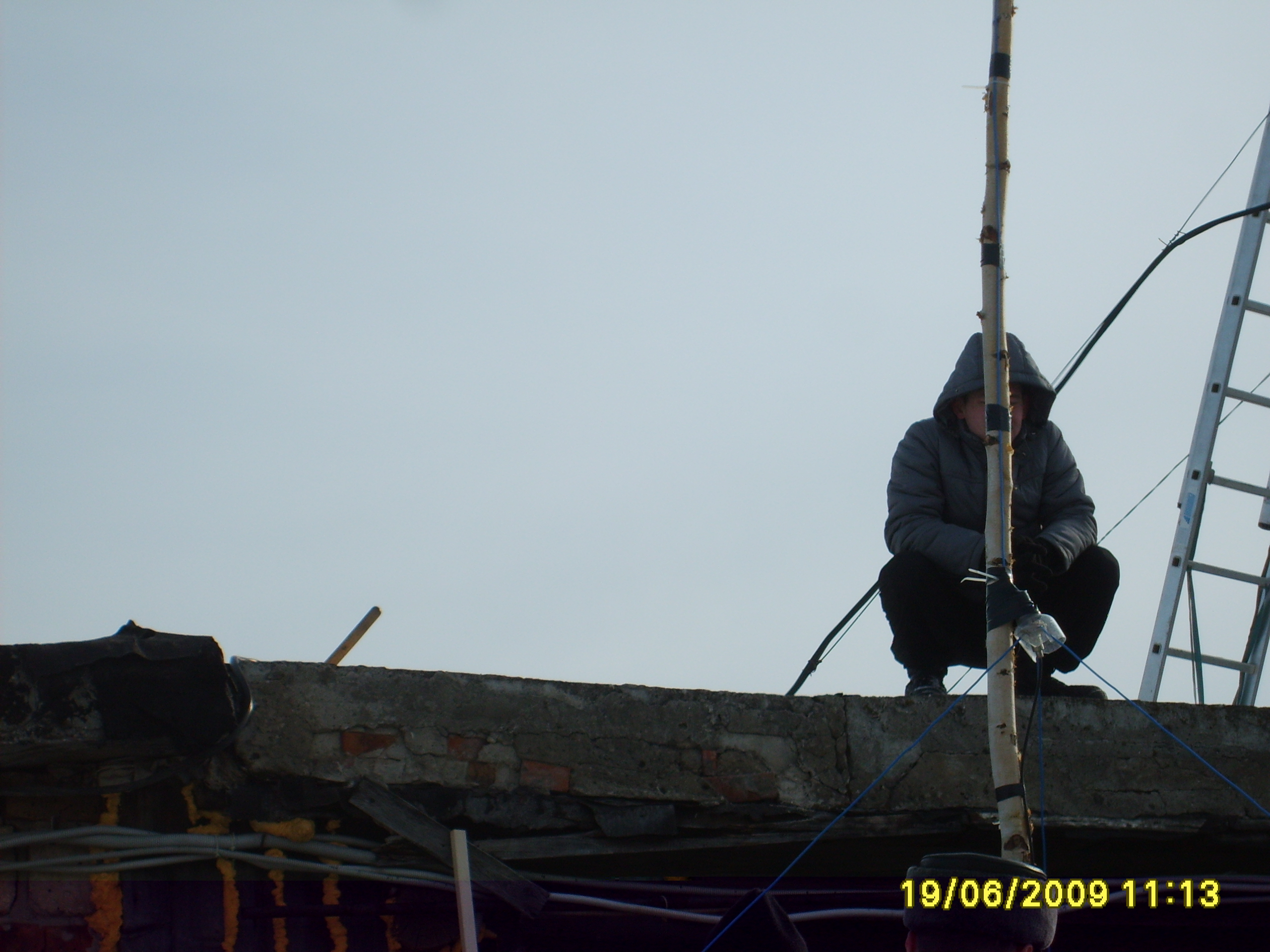 Работает, ксв не шибко уплыло, просто каркас антенны висит на противовесах. При порыве ветра может оторваться совсем, вместе с антенной. Главное, чтоб ни на кого не попало, если оборвет антенну, то и попугай работать соответственно перестанет.