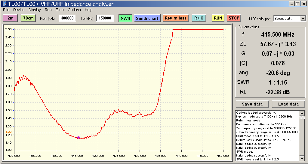 С тех далеких времен программа почему-то пропала с авторского сайта. Но после моего письма администрации сайта, две последние версии были возвращены для загрузки. За что им огромная благодарность от пользователей прибора. Фактически, при работе под управлением ПК прибор замеряет значение единственного параметра S11 на заданной частоте и отдает это значение в компьютер.