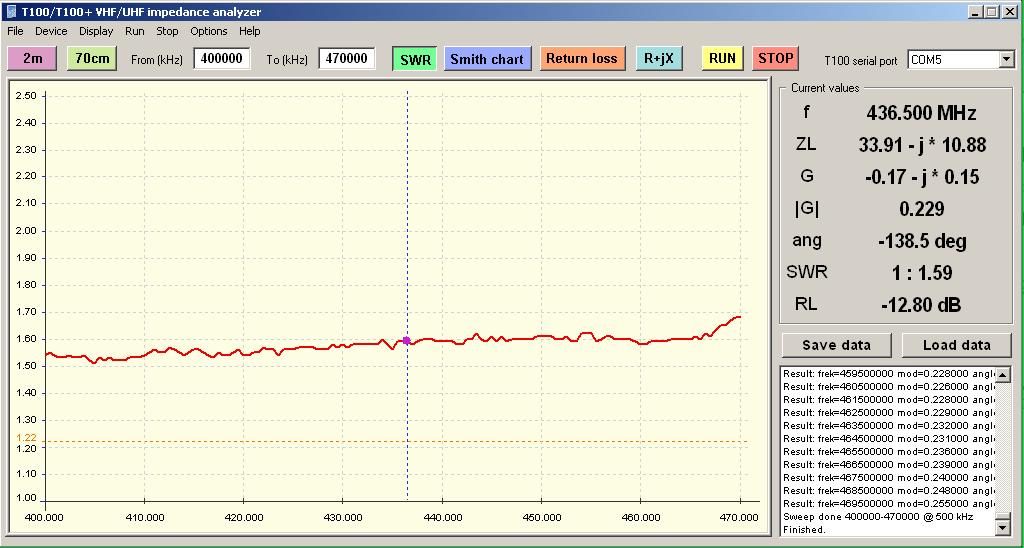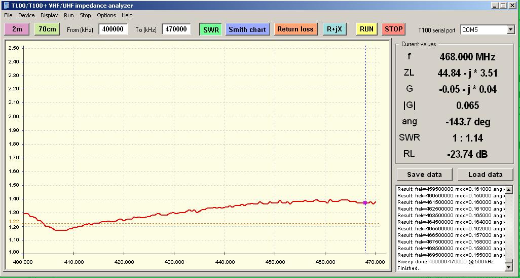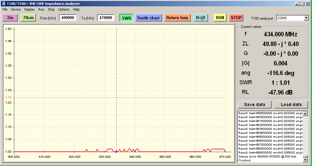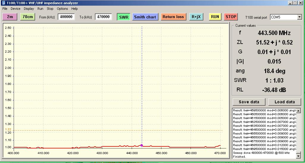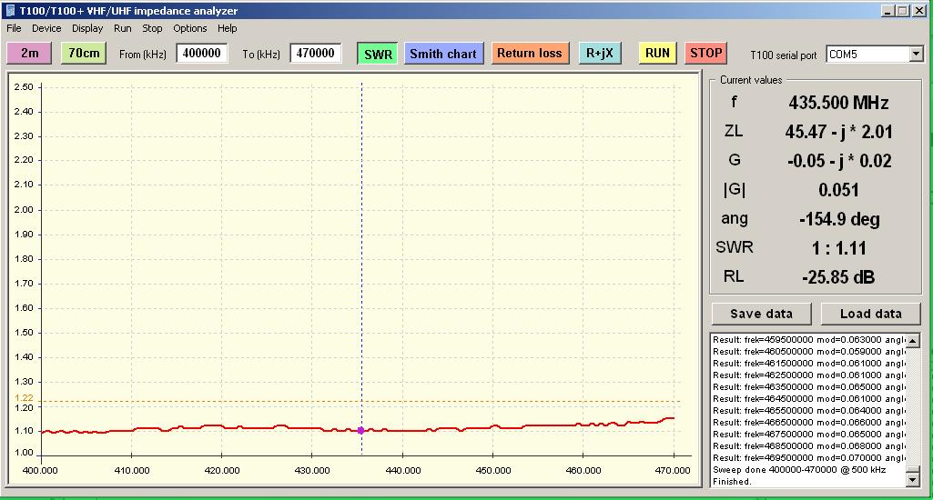 Затем с каждой нагрузкой "пробегает" по всему измеряемому диапазону частот. Для последней прошивки это два диапазона: 89МГц-230МГц и 390МГц-600МГц.
