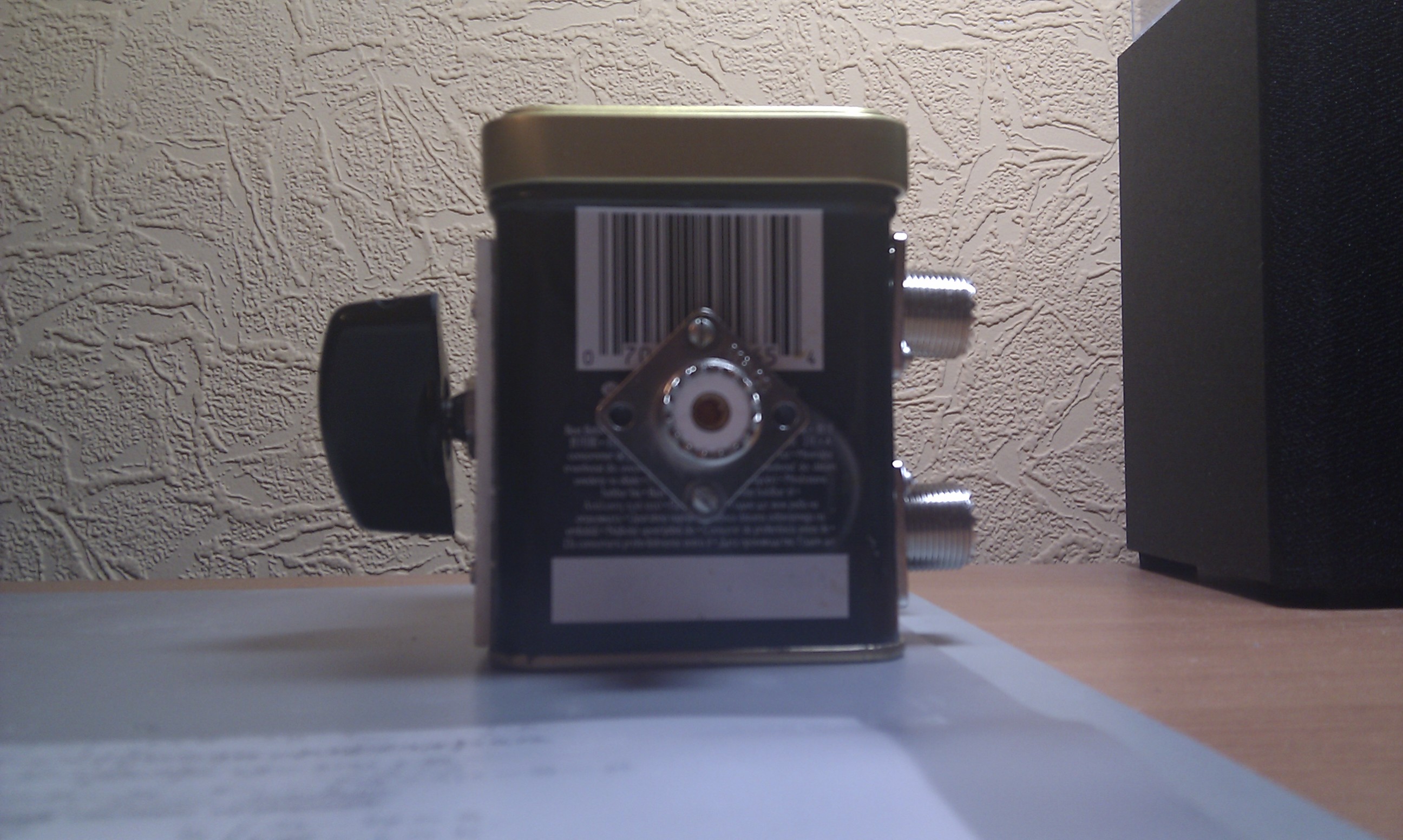Решил делать простой переключатель своими ручками. Прикупил 5 розеток, нашел галетный керамический переключатель 5П4Н, подходящего размера металлическую банку из под чая. В итоге получилось так: