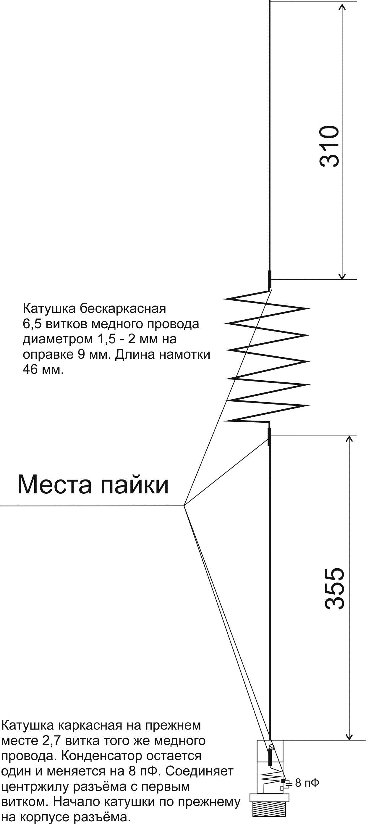 В результате получается коллинеар на 430 (с фазосдвигающей катушкой посередине) и что-то типа 5/8 на 144 (с удлинительной катушкой посередине)