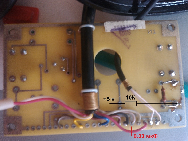 Параллельно микрофону включены конденсатор и резистор (3к3 на другой стороне платы). Но как мне помнилось на конденсаторный микрофон необходимо подать дополнительное питание.