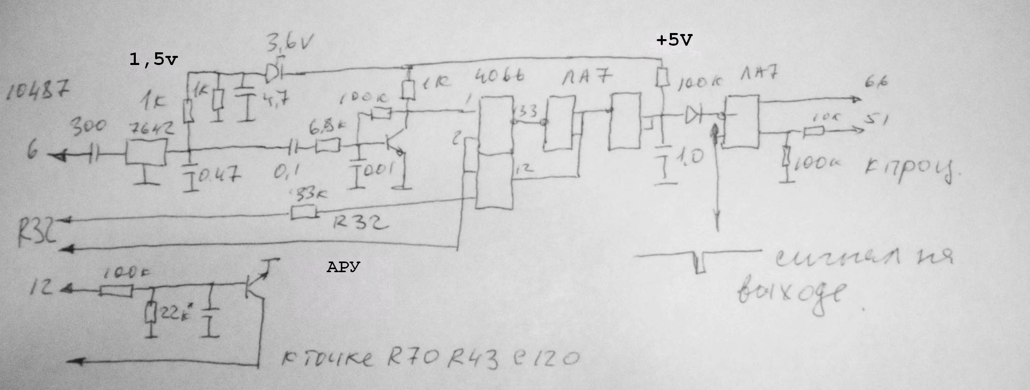В качестве AM приёмника применил 3х выводную китайскую микросхему ТА7642 ,это позволило разместить её рядом с фильтром ПЧ навесным монтажом ,хотя можно и другую например 157ха2 . Для нормальной работы приёмника в АМ необходима АРУ , в принципе охватить с минимумом сложностей можно только УВЧ и УПЧ , искажения появляются при -30 дб , реально затыков не наблюдалось . Резистор R50 заменил на 330к и верхний конец к затвору трвнзистора УВЧ это точка R70 R43 C120 .
