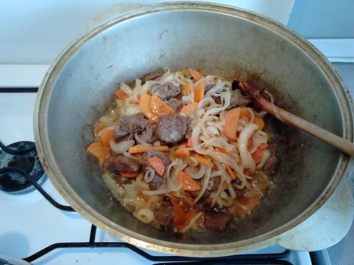 2. В разогретый на большом огне казан наливаем масло, хорошо нагреваем, прожарим луковицу и после ее почернения ее же и выбрасываем...