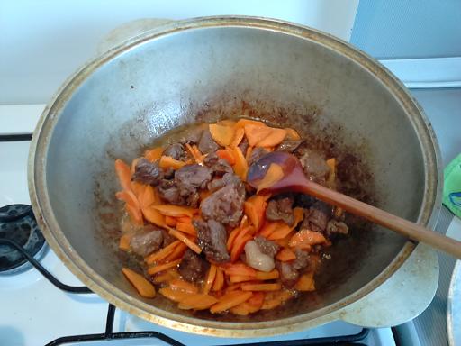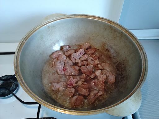 3. Закладываем мясо в казан не убавляя огня - шипит и шкваркает - хорошо... Обжариваем до появления румяного цвета...