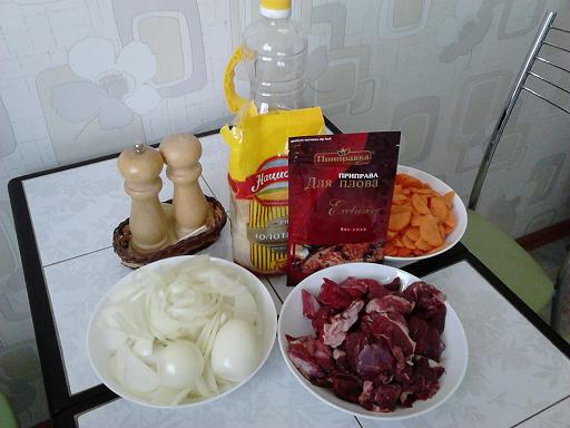 1. Берем: Баран (мясо с задней ноги) 1 кг, лук репка - 1 кг, морковь - 1 кг, рис - 0.5 кг, специи, соль, перец, масло растительное - 200 мл.
