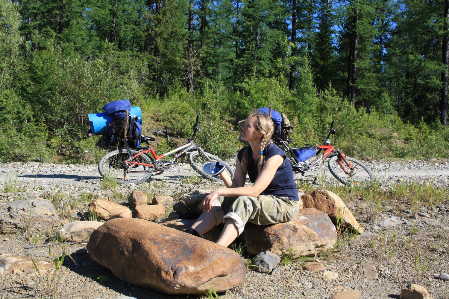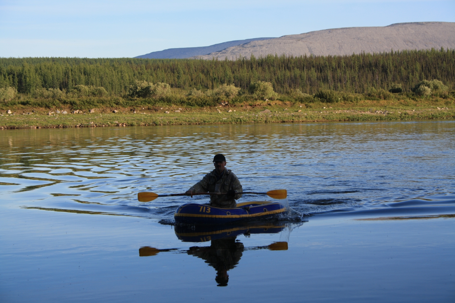 Оставивши машину на пристанционной стоянке, на пригородном поезде, состоящем из локомотива и одного вагона, едем в Инту. До Инты автомобильных дорог нет, то есть совсем нет возможности даже на сдвоенных колесах со всякими внедорожными премудростями добраться до Инты. В Инте, в четыре часа утра начинаем движение в сторону Желанной. По интернет данным нам предстоит преодолеть около ста двадцати километров гравийной дороги (местные водители говорили, что двести), и переправиться через реку Кожим. Для чего была припасена надувная лодка. На второй день подъехали к броду через Кожим. Быстрое течение и глубина около метра не оставляют шансов на «просто перейти». Накачиваю надувнушку и, похваливая себя за предусмотрительность, начинаю переправлять велосипеды, рюкзаки и напоследок – Ларису на другой берег. Во время переправы, поскользнувшись, падаю в воду, и мокрый и продрогший до костей делаю еще два рейса. Ночью стучу зубами и брякаю костями. Конденсат на палатке замерз в ледяную корку.