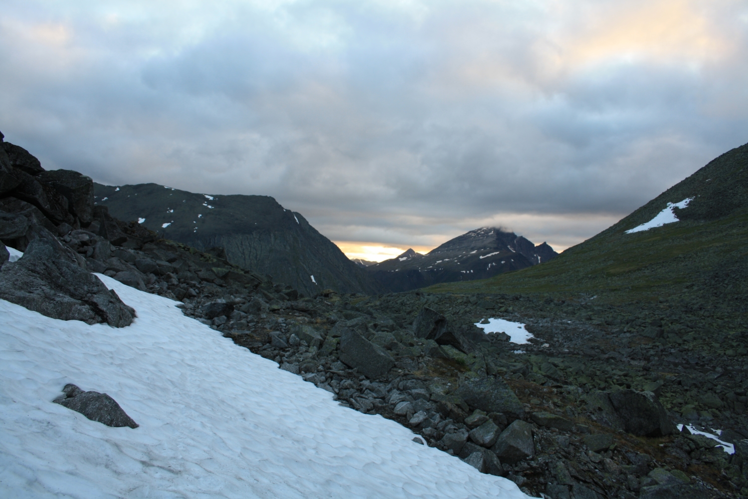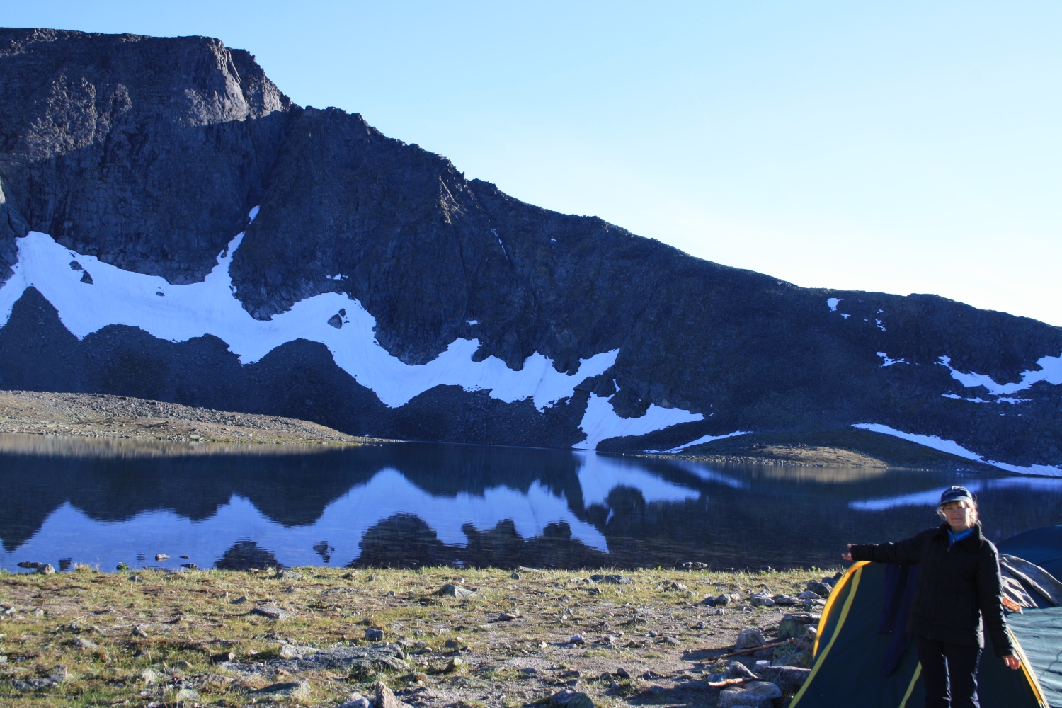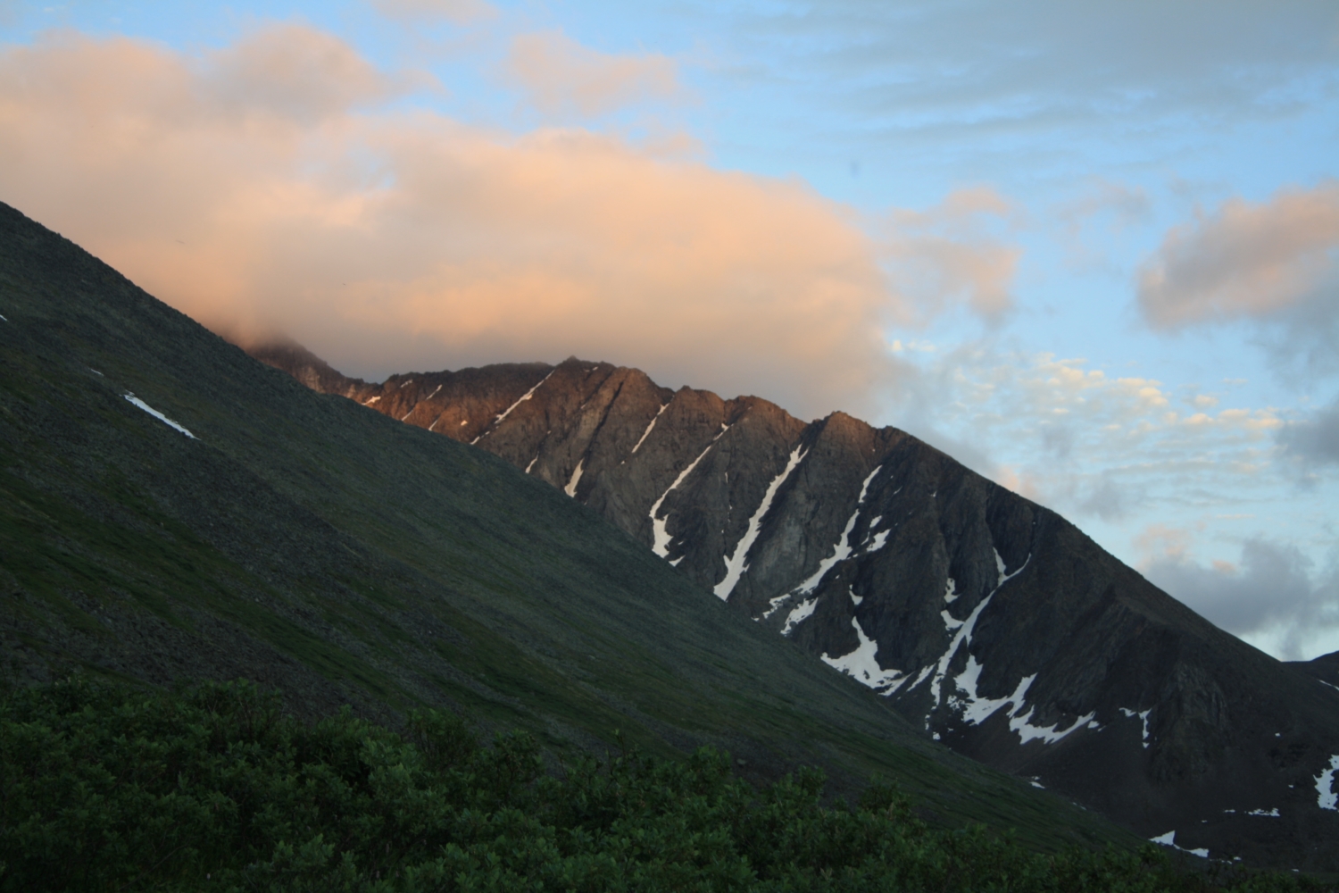 Перевал дался тяжело, особенно Ларисе. Не раз добрым словом вспомнили спасателей из Инты. Благодаря им, у меня в навигаторе остался трек оптимальнейшего маршрута. В условиях темноты он оказался бесценным подспорьем. Так-то надо было встать на ночь у слияния трех ручьев. Палатку ставим у озера в темноте. Холодный ветер срывает растяжки, палатка скрипит и трещит, и, кажется что вот вот разорвется в клочья. Отдаю Ларисе свой спальник и до утра чакаю зубами.