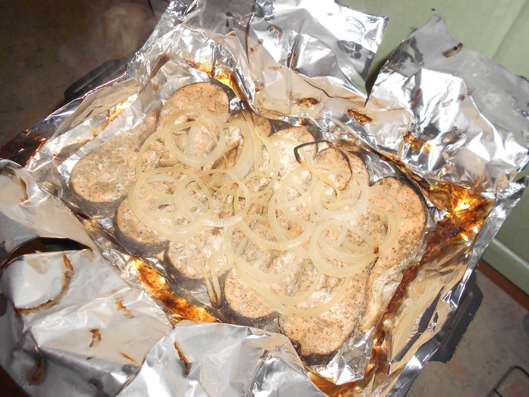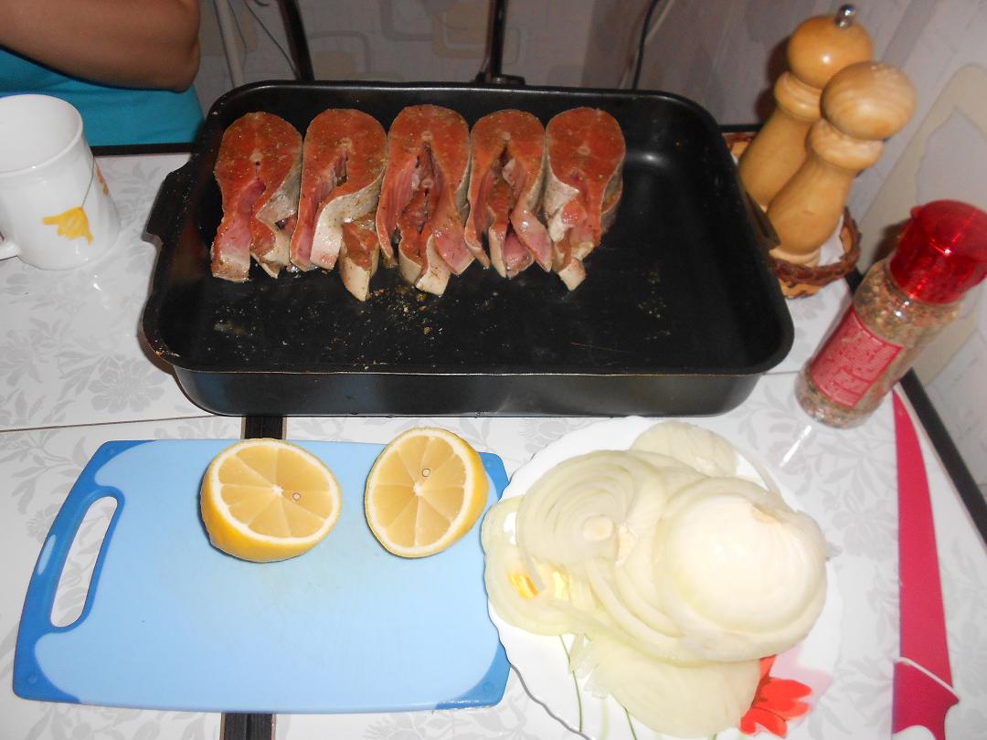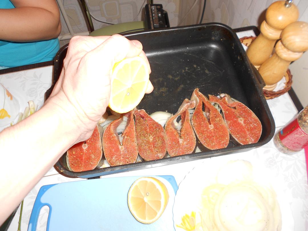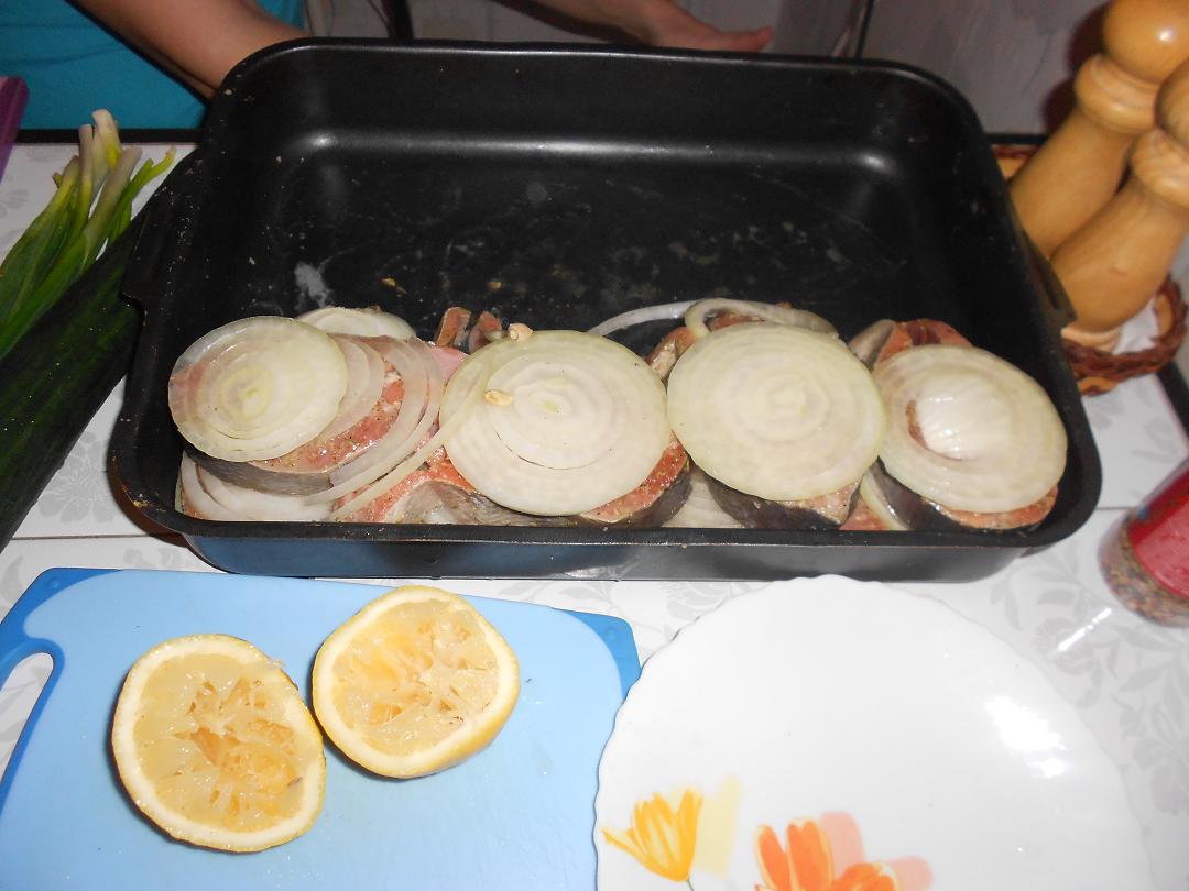 На лук выкладываем стейки и выжимаем на них прямо сверху пол лимона.