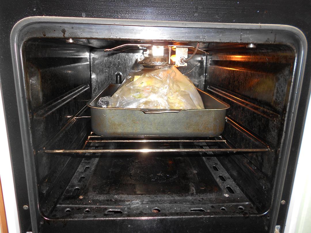 Заязываем наш рукав, укладываем на протиень и разогретую духоквку до 200 градусов на средний уровень. Есть у нас в запасе час - полтора...