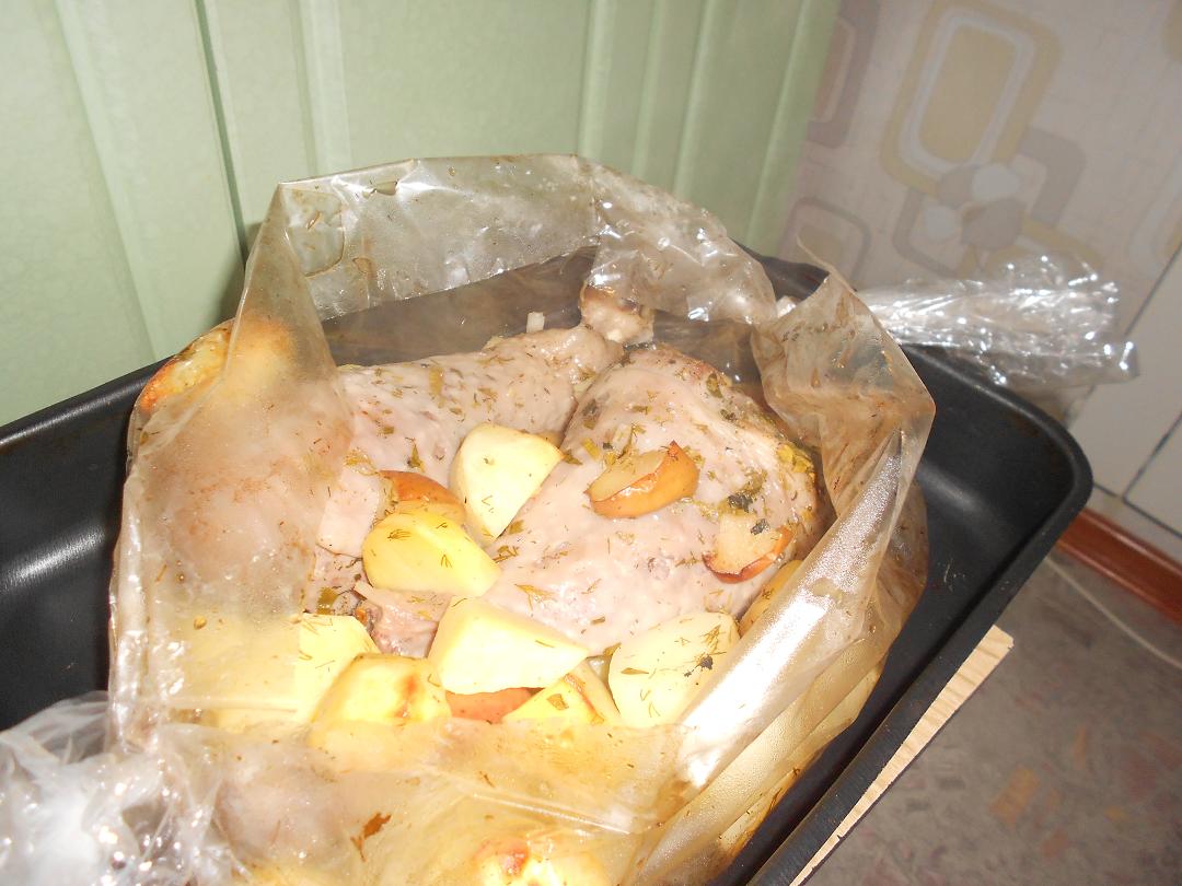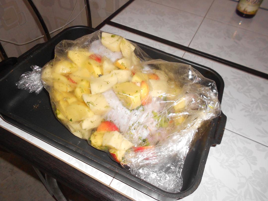 Спустя час.... Все это дело в пакет и в духовку на 45 мин при 250 градусах.... А тем временем отварим картошечки.... (ведро ойливье женщины уже нарубали)....