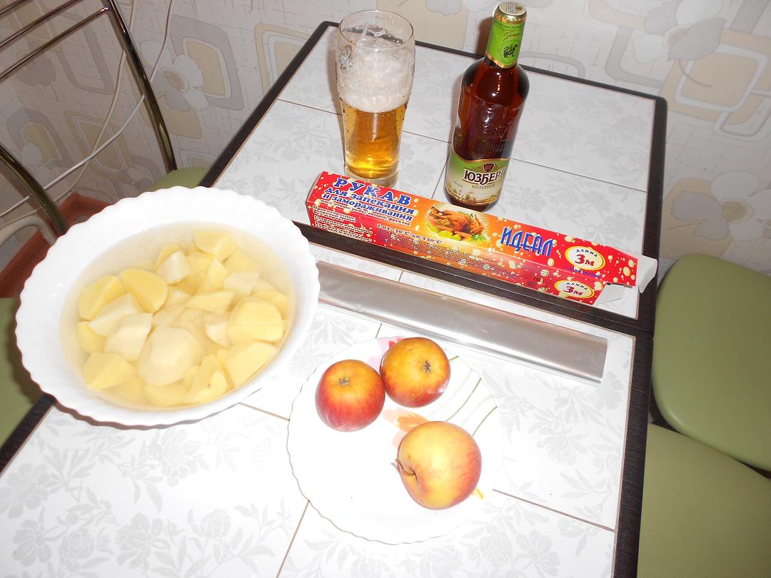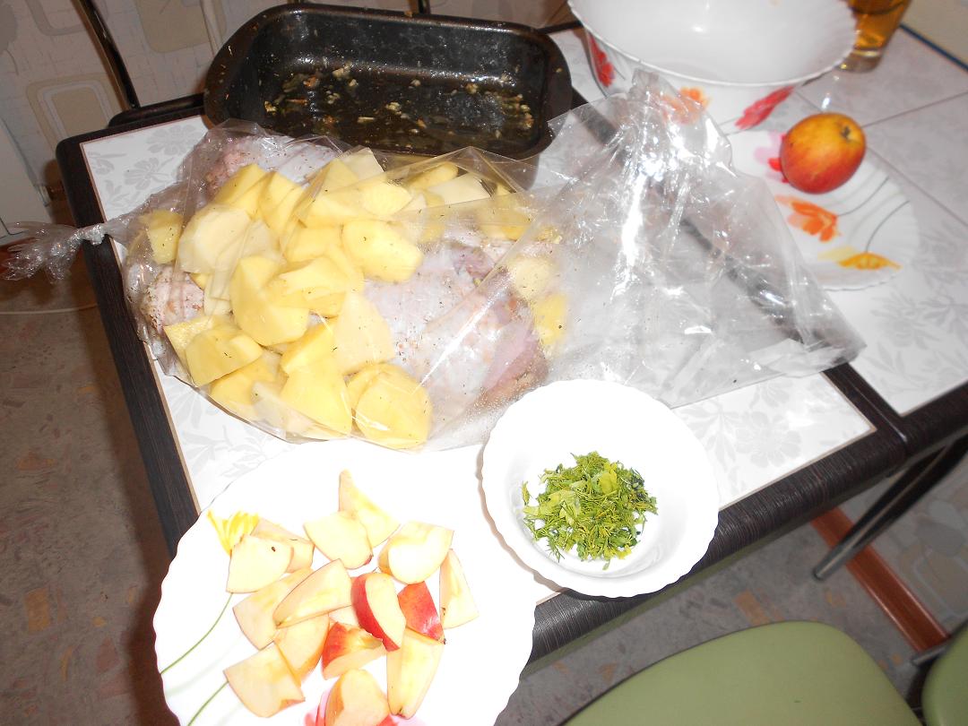 Спустя час, достаем наши ноги и пихаем рукав, предварительно заяза его с одной стороны. Туда же и картошку... Я еще и яблочко туда положил и петрушки с укропчиком мелко свежей порубил и туда же...