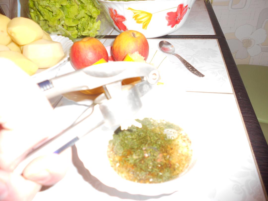 Готовим маринад: в пиалку наливаем немного масла растительного, туда же соль, перец, приправки, сущеный укроп и выжимаем пол лимона (в детстве не запомнил как пишется).