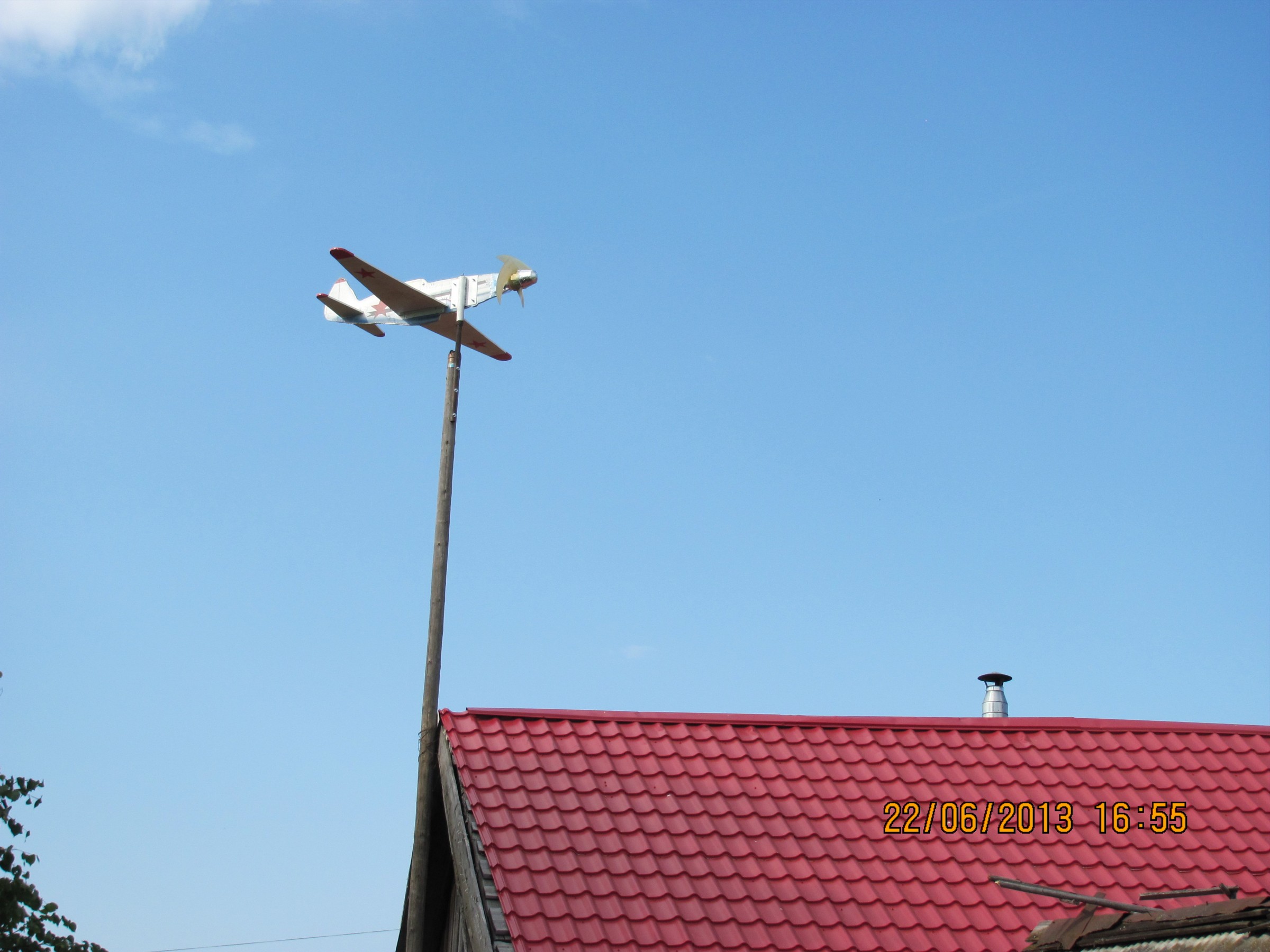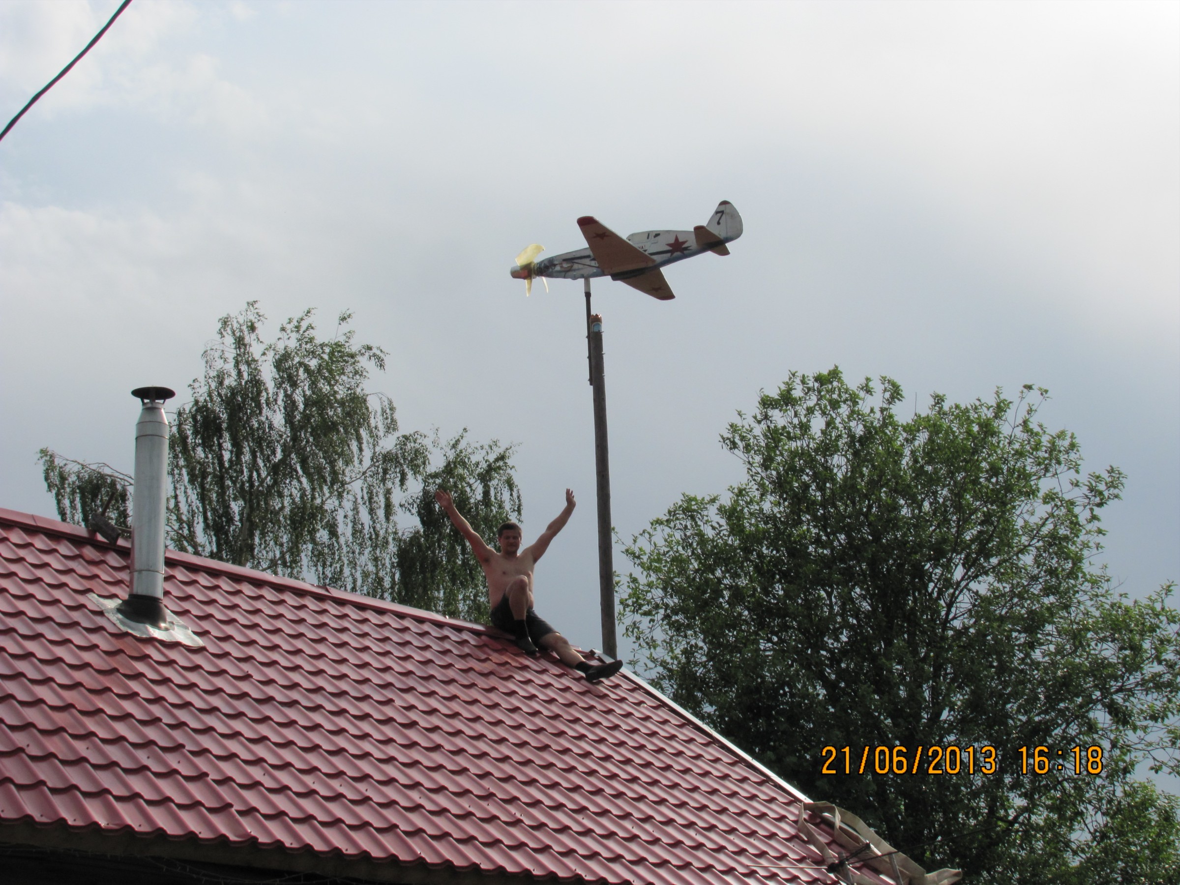 Наконец то самолёт вылетел из гаража! Как и обещал, выкладываю фотоотчёт какого то странного самолёта, который видели все, кто был у меня в гараже. Кто не в теме,объясняю - это флюгер на крышу дома, винт крутит генератор, он в свою очередь питает бортовые огни на концах крыльев. Никакой практической пользы от него нет, молока , яиц и мёда не даёт, просто для красоты! Ну направление ветра показывает, что иногда бывает полезно. Ожидаемый гул при сильном ветре отсутствует совсем, 0%, и это радует, а вот то что винт с большим шагом не выдаёт необходимых оборотов при слабом ветре - этого я не расчитал, косяк однако!
