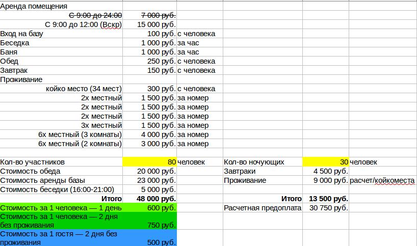 вход на базу+обед+аренда зала(сутки)+аренда беседки (5часов)+завтрак = 100+250+250+150 = 750р. На продукты: считаем по 400р.