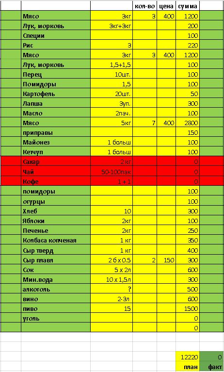 Я Наталье(Морячке) вечно говорю запиши что брать и сахрони ,то на пикник вечно набарем продуктов разных а потом обратно веземСалют писал(а):. У меня история всех закупок продуктов, на все мероприятия хранится. И я каждое мероприятие в таблице меняю состав и количество продуктов.