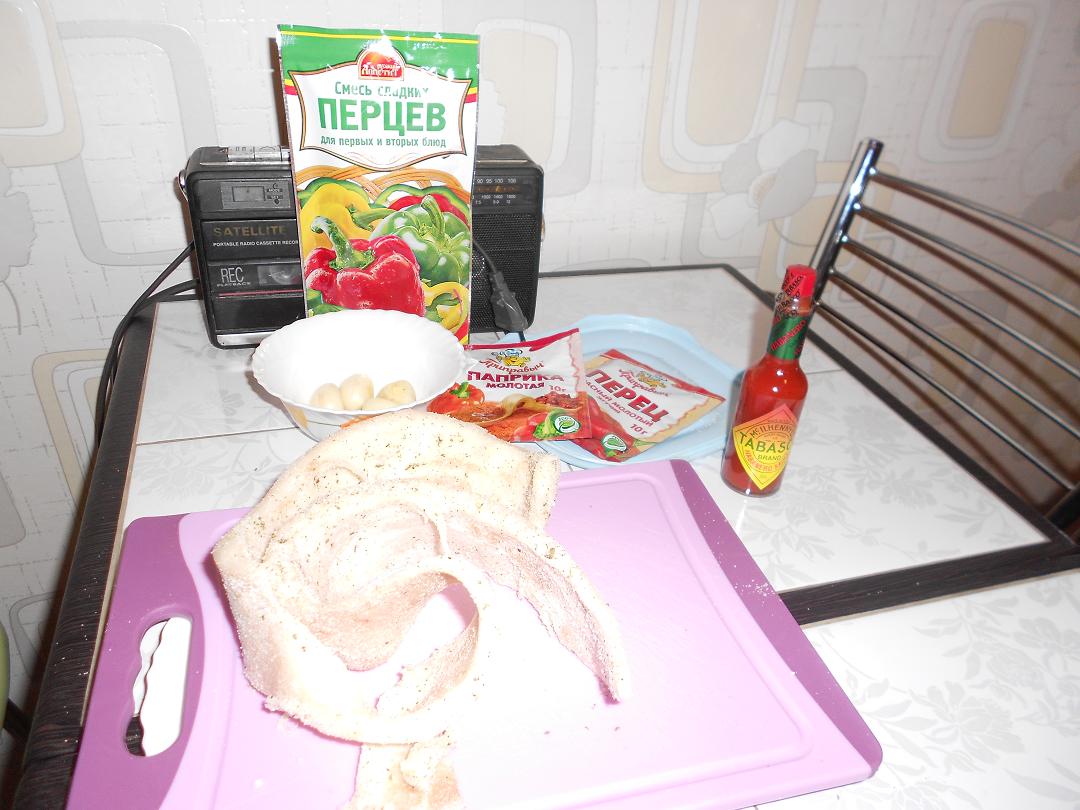 Еще раз достаем, счищаем соль, давим чеснок, мешаем жгучий перец, сухую паприку.